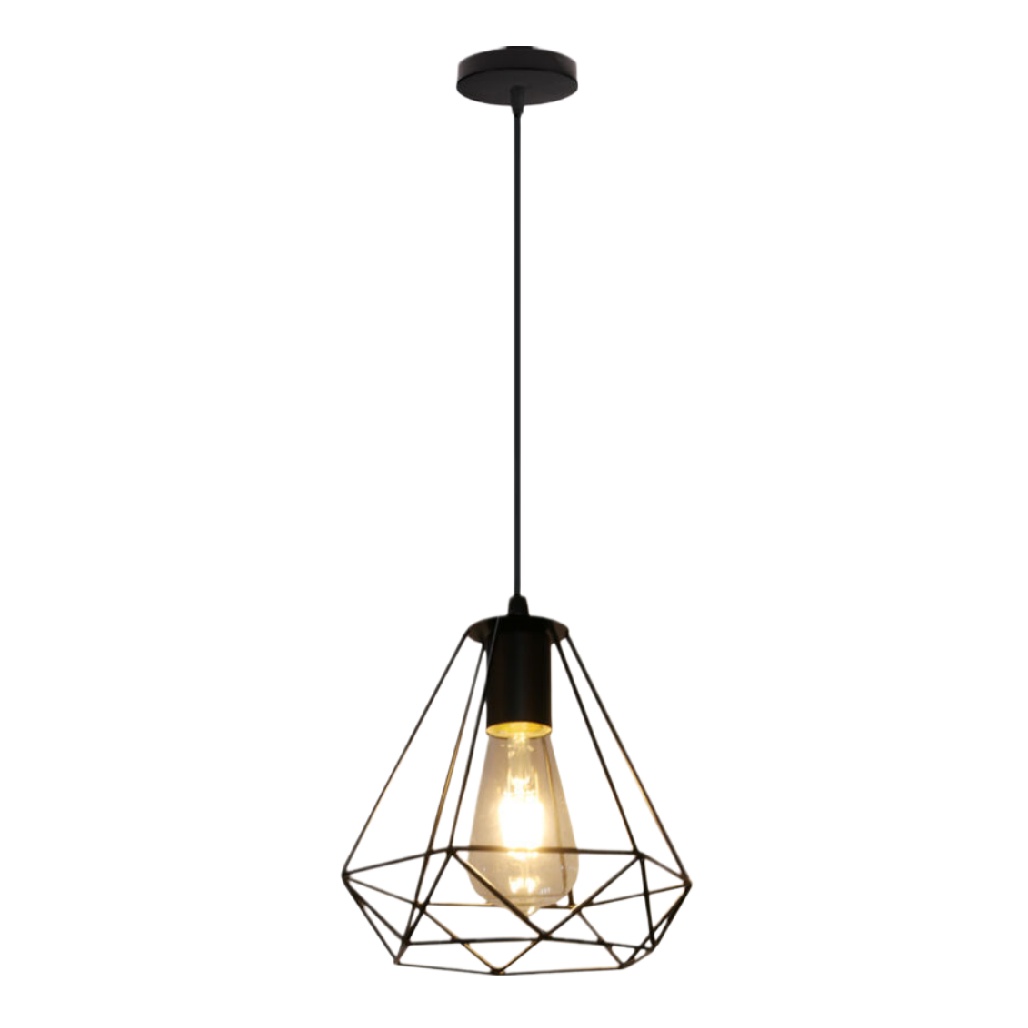 Titre technique : "Suspension en métal noir avec design géométrique"