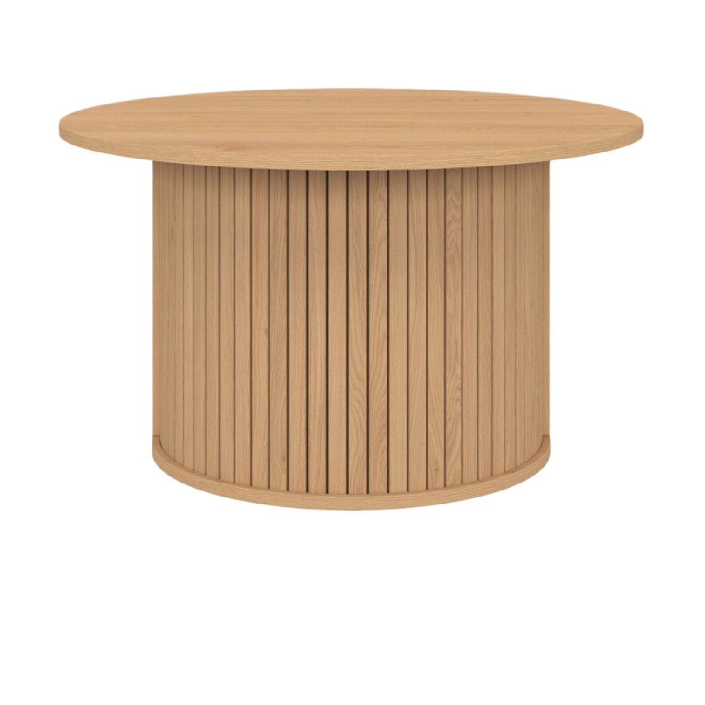 Table ronde en bois avec design en lattes verticales.